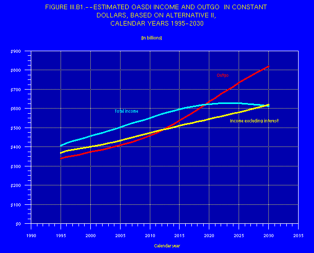Figure III.B1 provides a comparison of outgo with total annual income (including interest) and annual income excluding interest, for the OASDI program under intermediate assumptions. All values are expressed in constant dollars, as shown in table III.B2. The difference between the income values for each year is equal to the trust fund interest earnings. Thus the figure illustrates the fact that, under intermediate assumptions, combined OASDI expenditures will be payable from (1) current tax income alone through 2012, (2) current tax income plus a portion of annual interest income for years 2013 through 2019, and (3) current tax income, annual interest income, plus a portion of the principal balance in the trust funds for years 2019 through 2029, i.e., through the year preceding the year of trust fund exhaustion.