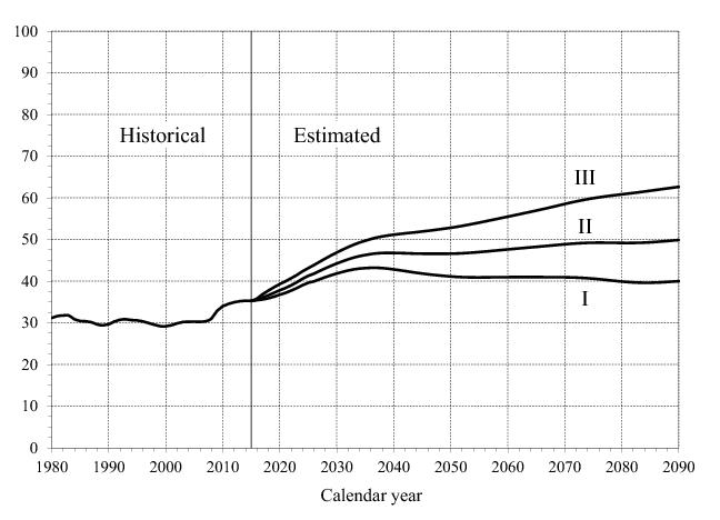 The effect of the demographic shift under the three alternatives on the OASDI cost rates is clear when one considers the projected number of OASDI beneficiaries per 100 covered workers. Compared to the 2015 level of 35 beneficiaries per 100 covered workers, the Trustees project that this ratio rises to 46 by 2035 under the intermediate assumptions because the growth in beneficiaries greatly exceeds the growth in workers. By 2090, this projected ratio rises further under the intermediate and high-cost assumptions, reaching 50 under the intermediate assumptions and 63 under the high-cost assumptions. Under the low-cost assumptions, this ratio rises to 43 by 2035 and then declines, reaching 40 by 2090. Figure