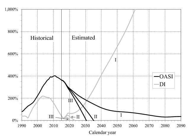 Under the intermediate assumptions, the OASI trust fund ratio has declined since 2011 and continues to decline from 357 percent at the beginning of 2016