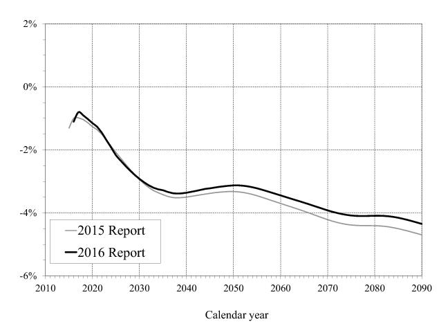 Figure IV.B4 compares the annual cash-flow balances for this report and the prior year’s report for the combined OASDI program over the long-range (75-year) projection period. The figure illustrates the annual effects of the changes described earlier in this section.