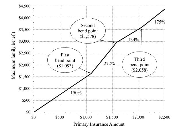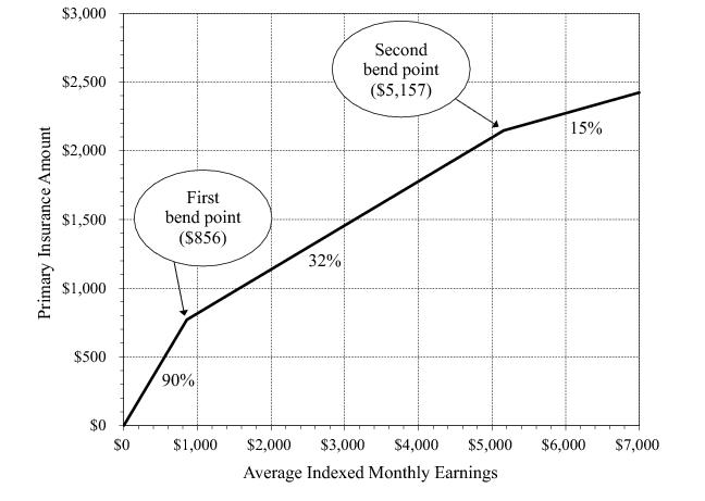 The bend points in the formula for computing the primary insurance amount (PIA) for workers who reach age 62, become disabled, or die in a given year. As figure V.C1 illustrates, these two bend points define three ranges in a worker’s average indexed monthly earnings (AIME). The formula for the worker’s PIA multiplies a 90, 32, or 15 percent factor by the portion of the worker’s AIME that falls within the three respective ranges, and then adds the resulting products together.