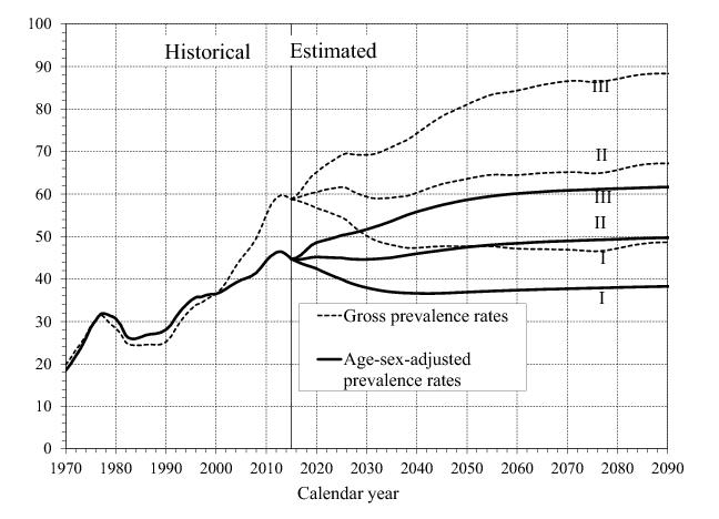 As mentioned above in the discussion of incidence and termination rates, the age-sex-adjusted prevalence rate isolates the changing trend in the underlying likelihood of receiving benefits for the insured population, without reflecting changes in the age distribution of the population. As with incidence rates, gross disability prevalence rates declined relative to the age-sex-adjusted rate when the baby-boom generation reached working age between 1970 and 1990; this trend reflects the lower
