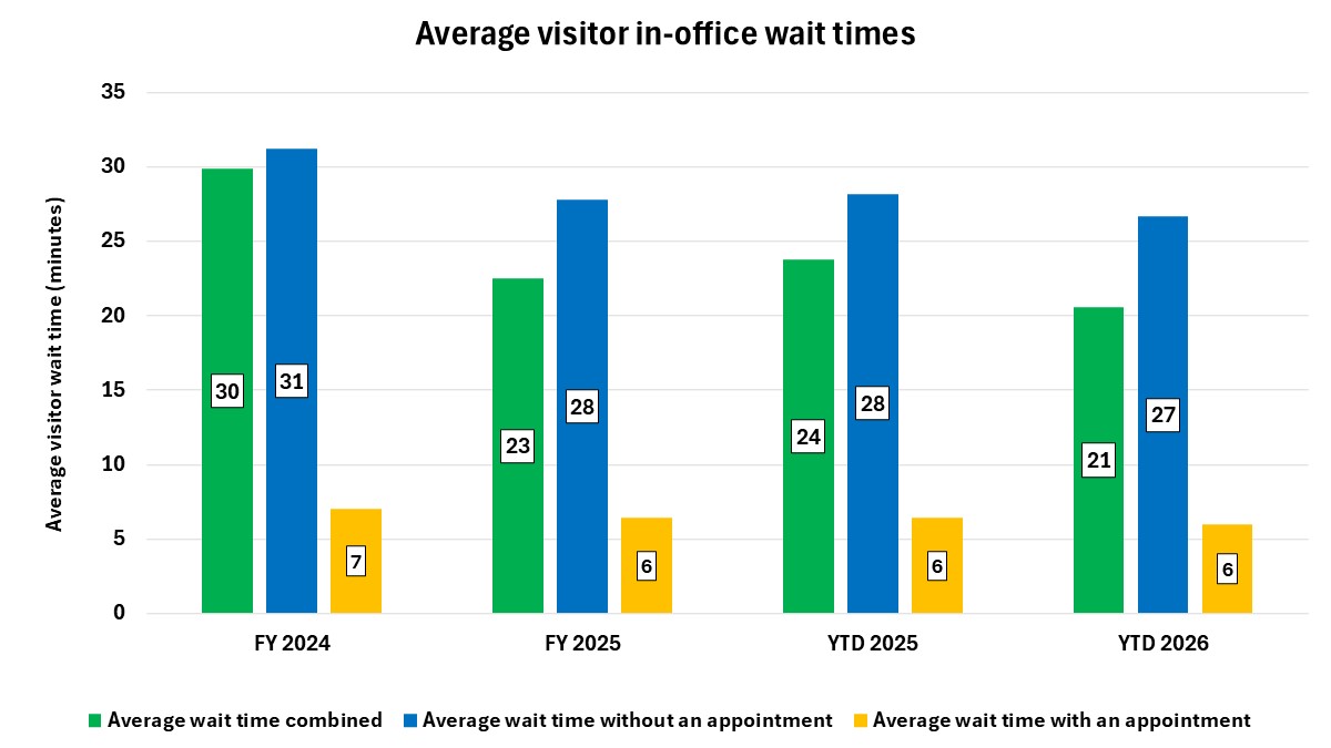 Our most recent monthly performance results for each service channel are available in the boxes above.  We are improving performance across all our service channels. Compared to service levels in February 2025, we estimate our reduction in wait times through February 2026 is saving the public 13.3 million hours.  Below are the time savings by service channel.